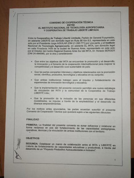 The resolution of the agreement was attached to the descriptive document and later, after having received it, the act of signing was carried out by those who are today in the Board of Directors of the entity in front of the representatives of the National Institute of Technology Agricultural.