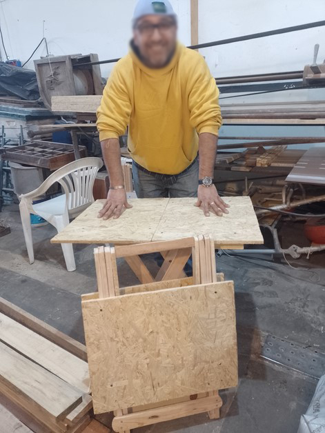 Allí sólo estuvo un tiempo ya que a poco de andar al ver que había maquinarias de carpintería, pidió le diesen la oportunidad de usarlas para tareas específicas y desde allí logra desarrollar el modelo de una mesa que para ello consulta de manera previa en el mundo web.