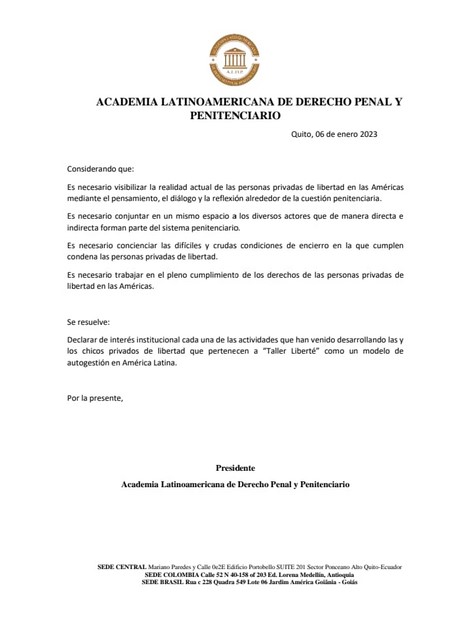 Declarar de interés institucional cada una de las actividades que han venido desarrollando las y los chicos privados de libertad que pertenecen a los chicos privados de libertad que pertenecen a “Taller Liberté” como un modelo de autogestión en América Latina.